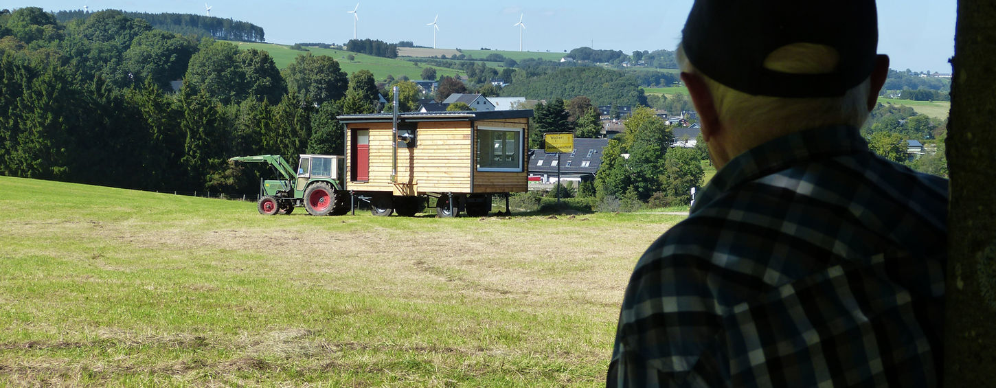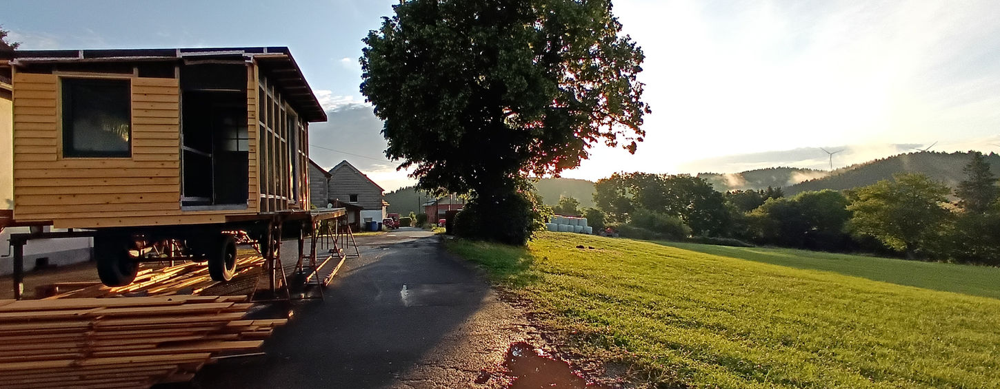 Falls du keinen Caravan, Wohnmobil, Zelt o.ä. besitzt oder nutzen magst, so kannst du auch eines unserer tiny houses buchen. Wir bauen unsere tiny houses selbst und nach Möglichkeit und Sinnhaftigkeit aus recycelten Materialien. Die tiny houses bieten lediglich eine Schlaf- und Sitzgelegenheit. Strom ist in den tiny houses vorhanden. Eine kleine Küche und eine Toilette befinden sich im Haupthaus. Die Dusche befindet sich im Außenbereich. Bis zu acht tiny houses sollen auf der Projektfläche inmitten der Natur aufgestellt werden. Ab Frühjahr/Sommer 2026 planen wir die ersten beiden tiny houses in Betrieb zu nehmen. Das Besondere wird sein, dass diese tiny houses langfristig inmitten einer Landschaft aus Wassererntegräben, Teichen und Waldgartenstreifen stehen werden. Diese Landschaft soll über die kommenden Jahre hinweg entstehen und kann im Rahmen von Seminaren von euch mitgestaltet werden.