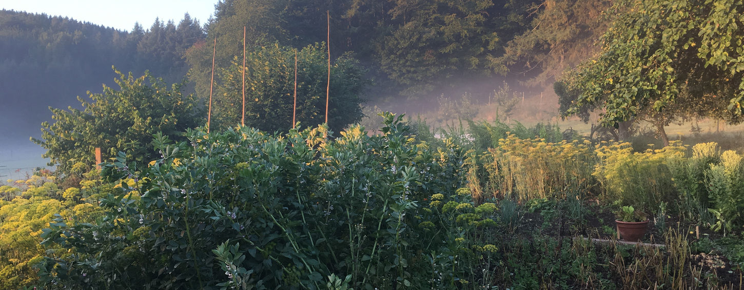 Wer aus einer Konsumgesellschaft aussteigen mag, muss wieder etwas von Wert produzieren. Für die überlebensnotwendigen Dinge wollen wir hier weitgehend selber Sorge tragen. Somit ist der Anbau von guter Nahrung und die Mitgestaltung lokaler Netzwerke für uns besonders wichtig. Besonders mehrjährige Pflanzensysteme, haben es uns dabei angetan. Einen Waldgarten mit funktionierendem Wasserhaushalt anzulegen und diese Räume als Räume der Rückbesinnung und Gesundung zu nutzen, ist ein Lebensziel. Darüber hinaus möchten wir diesen Ort auch anderen Menschen zugänglich machen und durch ihr Mitwirken, gemeinsame Erfahrungen möglich machen.